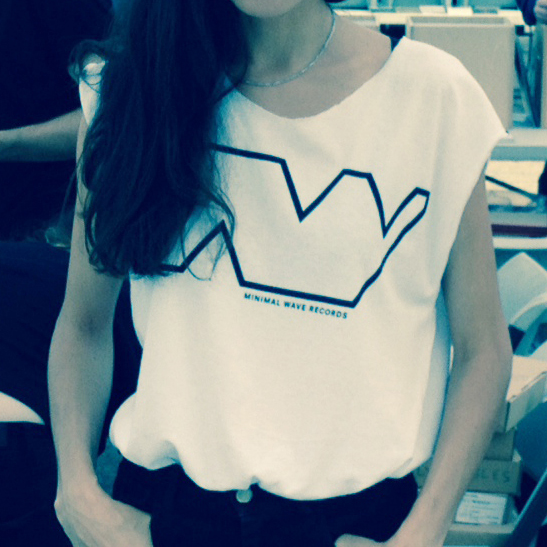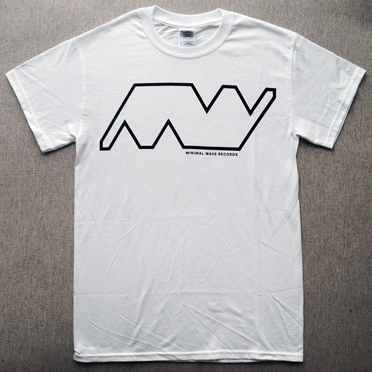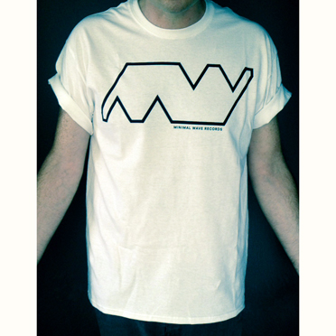 Minimal Wave logo outline in black with text silkscreened on a 100% cotton white t-shirt. Men’s large pictured in first image, custom cut men’s medium pictured in second image.
