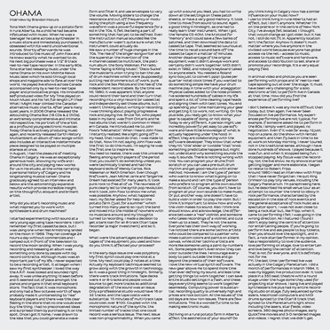‘Hello. My name is Ohama, and I live on a potato farm in Western Canada.’ It’s hard not to smile during the deadpan opening of Tona Walt Ohama’s ‘The Drum’, but Ohama is deadly serious. Composing entirely from an underground studio beneath his parents’ potato farm in Rainier, Alberta, Ohama formed a one-man synthpop tour de force, putting out a handful of records in the mid 80s that became cult classics. Using then state-of-the-art keyboards, drum machines, vocoders and analogue reel tape, Ohama created complex, evolving songs. Found sounds such as dogs barking, lapping waves, and industrial machinery were blended with audio lifted from news reports and chatshows. Ohama then added his own abstract, cynical lyrics. The result was futuristic, paranoid, ’80s techno.